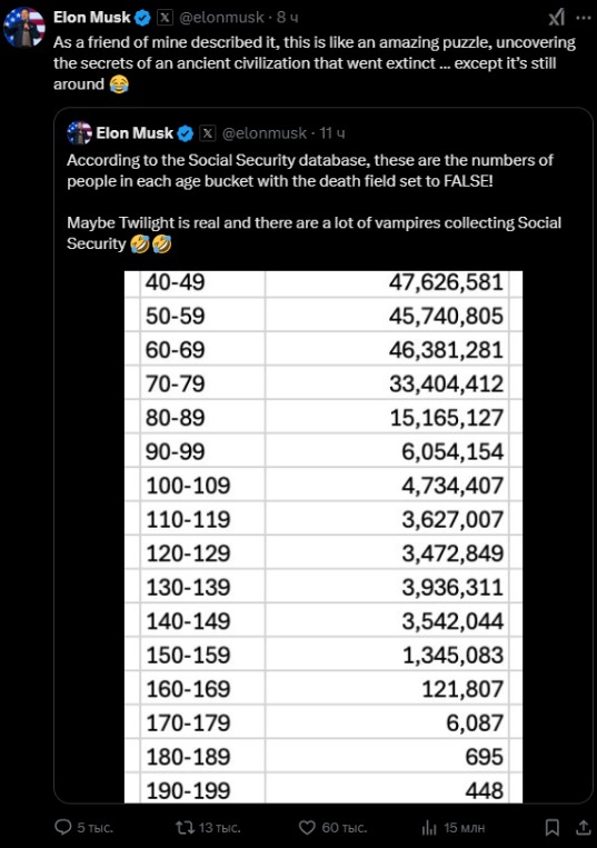 Маск опублікував таблицю з віковими даними американців, які отримують соціальну допомогу. Серед них є не лише кілька мільйонів живих американців у віці 120-249 років, а й один «довгожитель», віднесений до вікової групи 360-369 років. Маск пожартував, що у США живе «багато вампірів, які отримують соціальну допомогу».