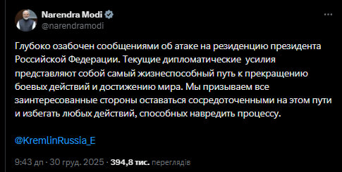 «Глибоко стурбований повідомленнями про атаку на резиденцію президента Російської Федерації», – написав Нарендра Моді. Політик також додав, що саме дипломатичні зусилля можуть привести до миру та припинення бойових дій.