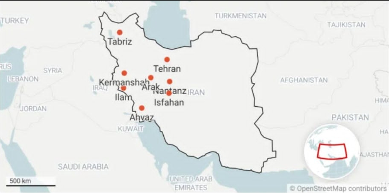 - Тебріз – вибухи поблизу ядерного дослідницького центру та двох військових баз;