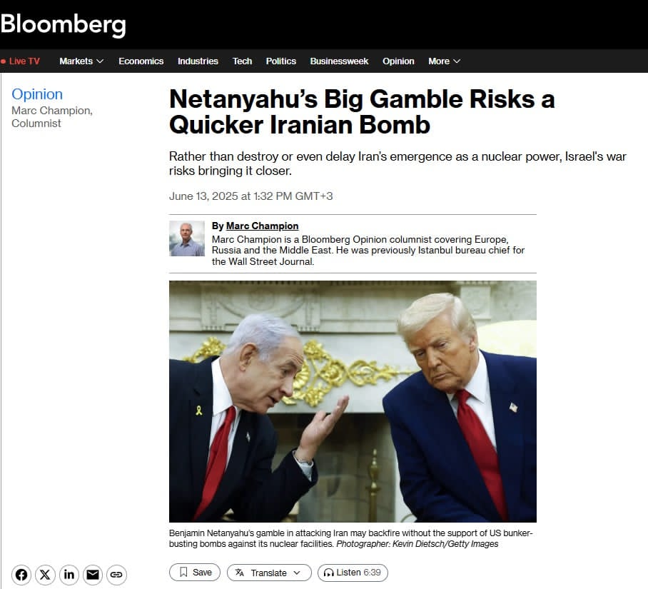 «Ще одне важливе питання полягає в тому, чи ґрунтується план Нетаньягу щодо успіху у війні, яку він розпочав, на залученні США. Серед військових аналітиків давно панує думка, що самостійно Ізраїль може завдати лише обмеженої шкоди; для успіху йому потрібні 15-тонні бомби для знищення бункерів, які є лише в Америки», – пише Bloomberg.