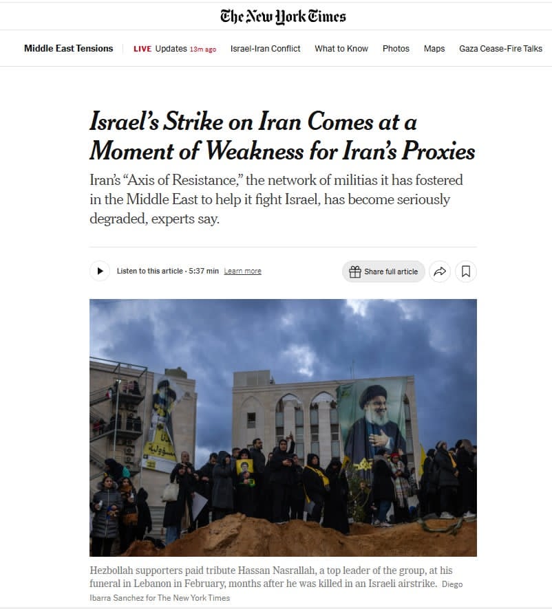Протягом чотирьох десятиліть Іран вкладав мільярди доларів, зброю та військові знання у грандіозний проєкт: створення мережі антиізраїльських ополчень на Близькому Сході, відомих як «Вісь Опору», які б приєдналися до Ірану у разі війни з Ізраїлем. Приголомшлива серія ізраїльських ударів по Ірану підкреслила, наскільки деградувала ця вісь за останній рік, пише New York Times. Мало хто очікує, що ці збройні групи змістовно відреагують на ізраїльську агресію, кажуть експерти.