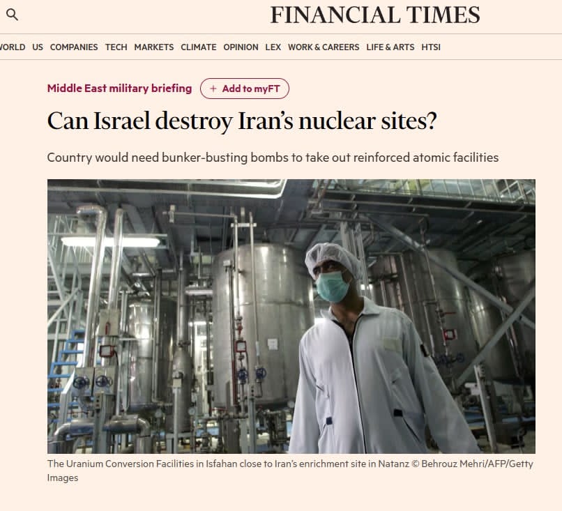 Financial Times також детально пояснює, чому Ізраїль атакував саме ці об’єкти. «На обох об'єктах експлуатуються тисячі центрифуг, призначених для виробництва різних марок збагаченого урану. Вони створили великий запас урану, збагаченого на 60%, який потребуватиме незначного подальшого збагачення для досягнення рівня збройового придатності в 9%. МАГАТЕ у травні підрахувало, що Іран накопичив загалом 408,6 кг, а сучасні центрифуги в Натанзі та Фордо виробляють в середньому 33,5 кг на місяць. Згідно зі звітом ІДІЛ, значну частину цього запасу збагаченого урану, можливо, було переміщено на об'єкт в Ісфахані, на завод з виробництва тепловиділяючих пластин.