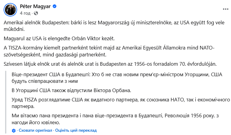 «А іншими словами – США також «відпускають руку» Орбана. Уряд «Тиси» розглядатиме США як ключового партнера – і як союзника у межах НАТО, і як економічного партнера. Будемо раді вітати президента й віцепрезидента у Будапешті з нагоди 70-ї річниці Революції 1956 року», – заявив Мадяр.