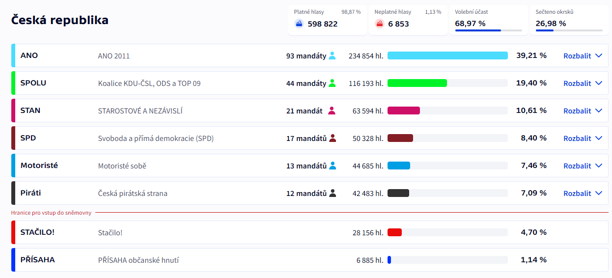 Як і показували соцопитування, лідером у перегонах є партія ANO, чий очільник вважається проросійським.