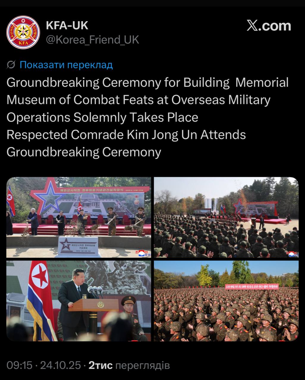 У Північній Кореї відбулася офіційна церемонія закладення меморіалу північнокорейським солдатам, які воювали на боці російських військ проти ЗСУ в Курській області РФ. До урочистостей долучився північнокорейський лідер Кім Чен Ин, посадовці та російський посол Олександр Мацегора.