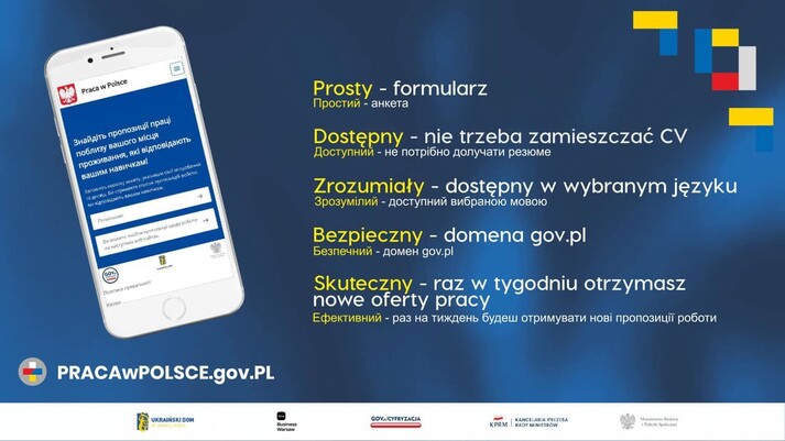 «Це дуже проста послуга. Вона дозволить громадянам України, які мають польський ідентифікаційний номер PESEL, знайти роботу за кваліфікацією. Дані, які має уряд свідчать про те, що серед громадян України, які прибули до Польщі та перебувають тут тимчасово, велику групу становлять люди з вищою освітою. Більшість з них – жінки. Понад пів мільйона людей можуть зацікавитися пропозиціями роботи», – розповів урядовий уповноважений з кібербезпеки Януш Цєшинький.