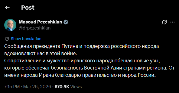 «Заяви президента Путіна та підтримка російського народу надихають нас у цій війні. Опір і мужність іранського народу обіцяють нові зв’язки, які забезпечать безпеку Східної Азії країнами регіону. Від імені народу Ірану дякую уряду та народу Росії», – йдеться у дописі Пезешкіана.