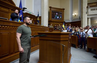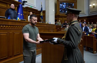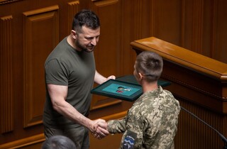 «Коли сьогодні, у День Української Державності, тут, у Верховній Раді України, перед усім українським народом я відзначатиму сильних людей за сильні вчинки «Хрестом бойових заслуг», я хочу, щоб усі українці відчували: ми – за спинами тих, хто на полі бою захищає нашу державу, а за нашими спинами – мільйонів українців, які живуть зараз, – ті, хто протягом століть творив українську історію, українську культуру та український характер», – сказав президент.