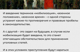 Також російські депутати впровадили нові статті в кримінальному кодексі РФ – «добровільна здача в полон» (від трьох до 10 років в'язниці, якщо немає ознак держзради) та «мародерство» (до 15 років). Серед обтяжливих обставин з'явилося скоєння злочину «під час мобілізації чи воєнного стану, у воєнний час».