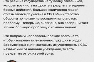 За його словами, ухвалені депутатами поправки до Кримінального кодексу жорсткіше регламентуватимуть процеси, що відбуваються і під час так званої «спеціальної військової операції». При цьому, виходячи з нових норм, кримінальній відповідальності підлягатимуть ті особи, які вже склали присягу та були перерозподілені у військові частини. Мовляв, ниніщніх «ухилянтів» новий законопроєкт не стосується.