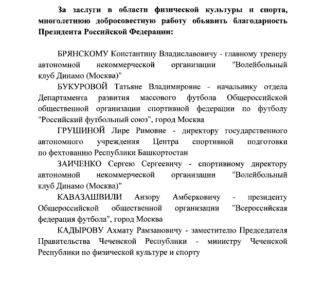 У документі зазначено, що подяку оголошено «за заслуги в галузі фізичної культури і спорту, багаторічну сумлінну роботу».