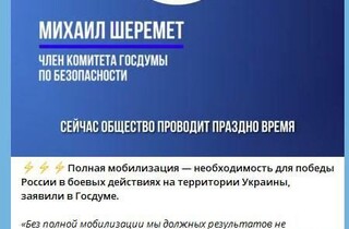 Депутат Державної думи РФ від «Єдиної Росії» Михайло Шеремет заявив, що «росіянам потрібно бути солідарними з тими, хто зараз воює». Він закликав провести у країні мобілізацію, щоб перемогти у війні проти України. Через що отримав багато нецензурної лайки у коментарях до свого посту. Про це пишуть пропагандистські ЗМІ.