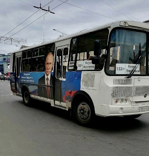 Один із рейсових автобусів, який їздить за маршрутом Калуга-Воротинськ, обклеїли портретами президента Росії.