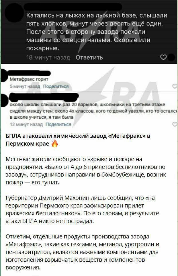 Уночі 17 лютого безпілотники Центру спецоперацій «Альфа» СБУ уразили одного з найбільших виробників метанолу у РФ та Європі. Завод «Метафракс Кемікалс» розташований у Пермському краї за понад 1600 км від кордону з Україною. Про це повідомляє «Главком» з посиланням на джерело у Службі безпеки.