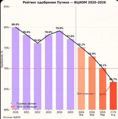 Всеросійський центр вивчення громадської думки, що належить державі, шостий тиждень поспіль фіксує зниження рейтингу схвалення діяльності президента РФ. Там зазначають, що рівень схвалення Путіна досяг найнижчого значення з часів початку повномасштабної війни проти України і продовжує знижуватися.