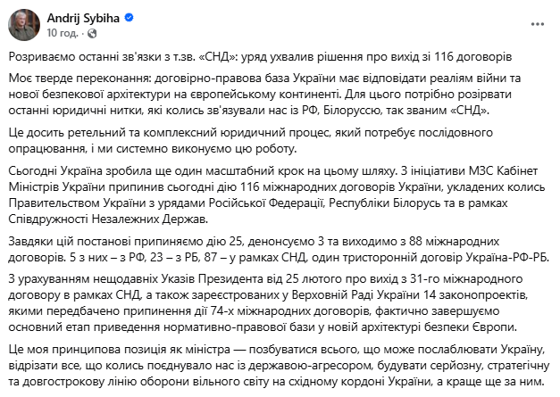 «Моє тверде переконання: договірно-правова база України має відповідати реаліям війни та нової безпекової архітектури на європейському континенті. Для цього потрібно розірвати останні юридичні нитки, які колись звʼязували нас з РФ, Білоруссю, так званим СНД», – йдеться в дописі міністра.