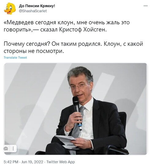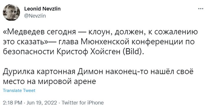 На Telegram-каналі «Стрелков» написали, що Дмитро Медведєв «злетів з катушок». Соцмережа процитувала главу Мюнхенської конференції з безпеки Кристофа Хойсгена, який на міжнародному симпозіумі назвав російського політика клоуном, а в кінці поглузувала із соратника Путіна.