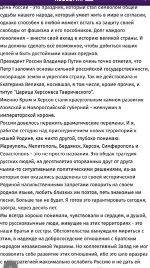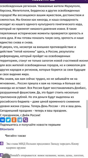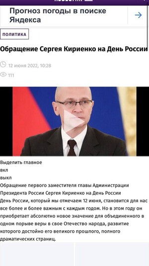 12 червня, у День Росії, на сайті провладного видання «Ізвєстія» (головою ради директорів власника ЗМІ, Національної медіагрупи, є коханка Путіна Аліна Кабаєва) з’явилася стаття під назвою «Звернення Сергія Кирієнка на День Росії».