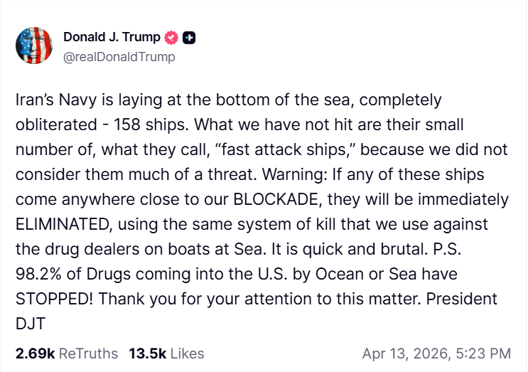 «Військово-морські сили Ірану лежать на дні моря, повністю знищені – 158 кораблів. Ми не вразили лише невелику кількість їхніх, як вони це називають, «швидкісних ударних кораблів», оскільки не вважали їх серйозною загрозою. Попередження: якщо будь-який з цих кораблів наблизиться до нашої блокади, його буде негайно знищено, використовуючи ту саму систему знищення, яку ми застосовуємо проти наркоторговців на човнах у морі. Це швидко і жорстоко. P.S. 98,2% наркотиків, що надходять до США морем, припинилися!», – написав Трамп.