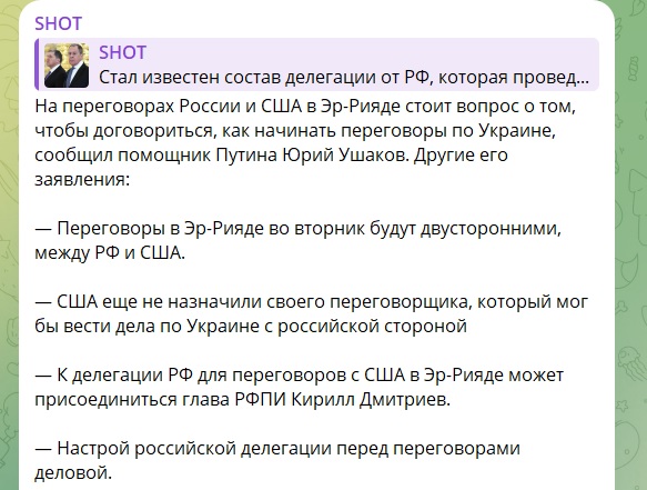 Крім того, вже відомо, хто увійде до складу російської делегації. Окрім, власне, Ушакова, це міністр закордонних справ Росії Сергій Лавров. Крім того, до них, можливо, приєднається голова Російського фонду прямих інвестицій Кирило Дмитрієв.