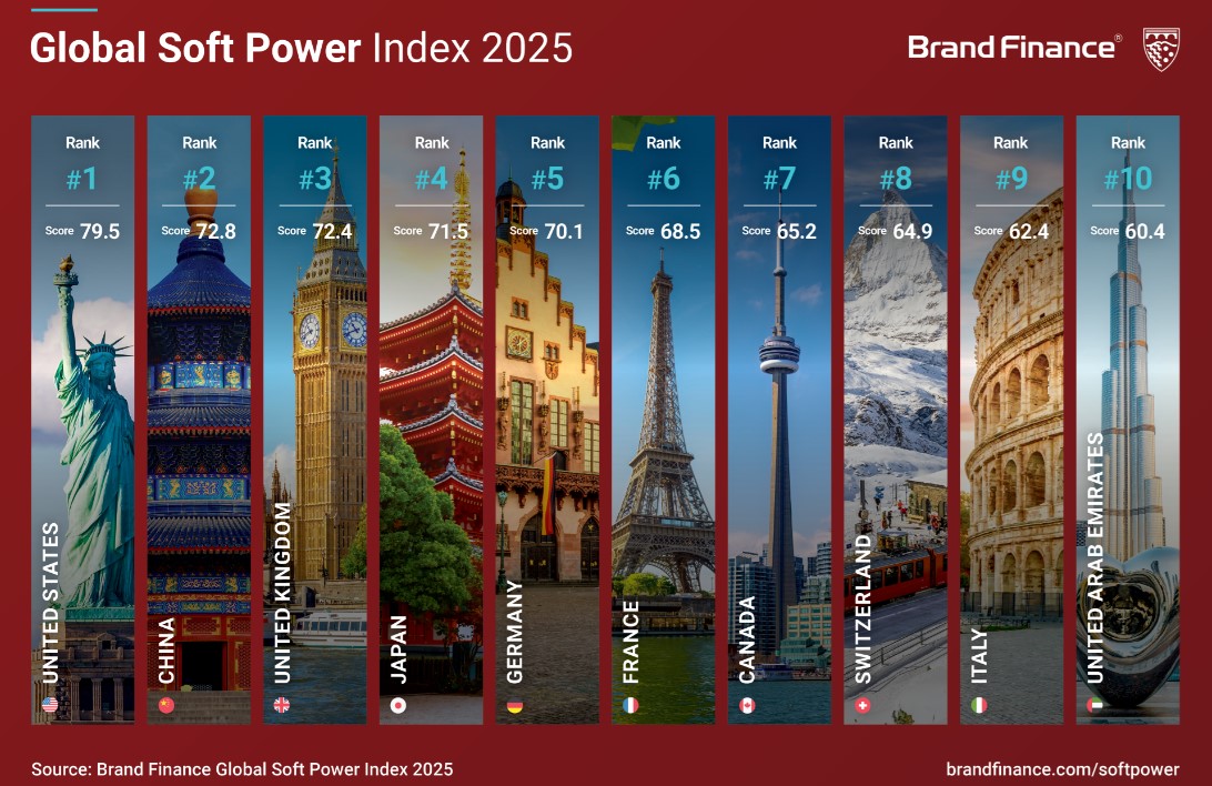 Brand Finance складає рейтинг «м'якої сили» країн (їх вплив на поведінку та переваги держав, компаній, спільнот та громадськості шляхом культурного та інформаційного впливу, а не за рахунок примусу) на основі опитування понад 173 тис. респондентів із понад 100 країн. Він включає всі 193 країни, що входять до ООН. Кожна їх оцінюється за 55 показниками. Global Soft Power Index розраховується вже шостий рік.