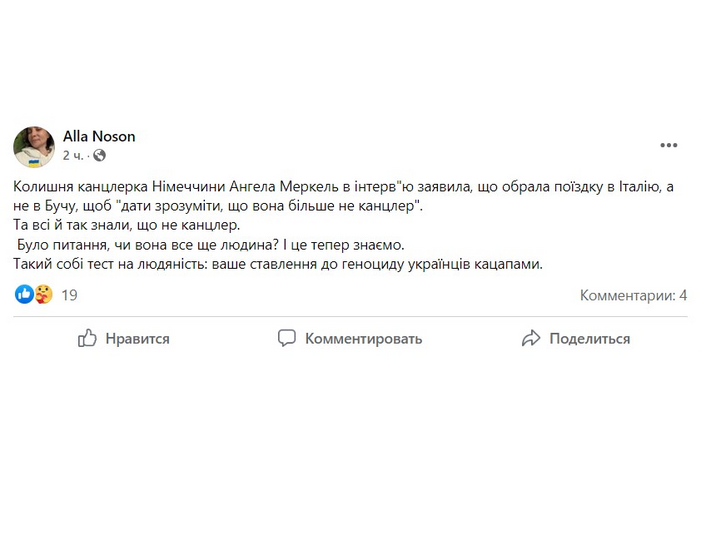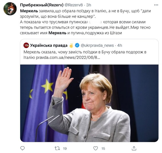 Користувачі соцмереж обурені поведінкою експолітикині та пишуть, що такими заявами Меркель намагається «відмазати свого друга Путіна» від кривавих наслідків війни диктатора в Україні.