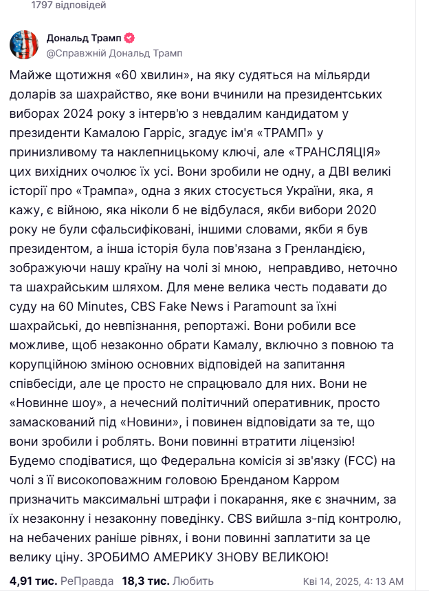 «Вони зробили не одну, а дві великі історії про «Трампа». Одна з яких стосується України, а інша історія була пов'язана з Гренландією, зображуючи нашу країну на чолі зі мною, неправдиво, неточно та шахрайським шляхом. Для мене велика честь подавати до суду на 60 Minutes, CBS Fake News і Paramount за їхні шахрайські, до невпізнання, репортажі», – йдеться у дописі.