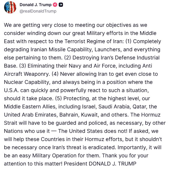 «Ми дуже близькі до досягнення наших цілей і розглядаємо можливість згортання наших масштабних військових зусиль на Близькому Сході щодо терористичного режиму Ірану», – заявив Трамп.