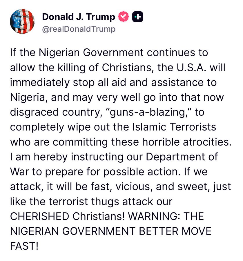 Так, американський президент назвав Нігерію «зганьбленою країною» і заявив, якщо та не вживе заходів проти вбивств християн, США припинять будь-яку допомогу і вдеруться в країну «зі зброєю в руках, щоб повністю знищити ісламських терористів, які вчиняють ці жахливі звірства».