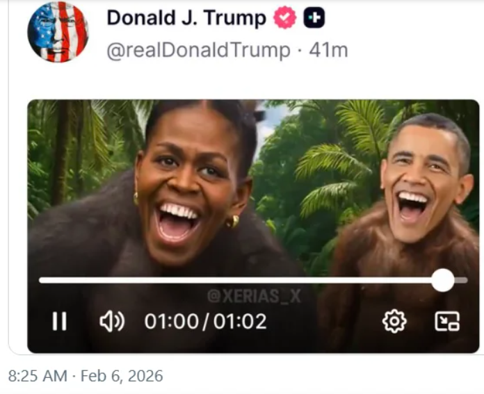 Президент США Дональд Трамп опублікував у соцмережі Truth Social відеоролик, у якому колишній президент США Барак Обама та його дружина Мішель зображені у вигляді двох мавп у джунглях, що спричинило різку реакцію з боку демократів. Про це повідомляє «Главком».