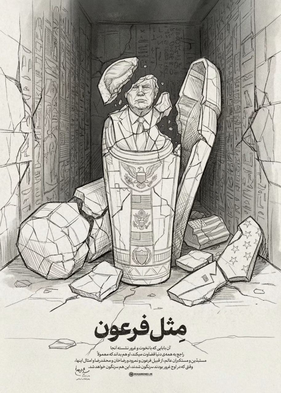 Тим часом офіційний акаунт верховного лідера Ірану аятоли Алі Хаменеї опублікував карикатуру, на якій Трамп зображений у вигляді саркофага в давньоєгипетському стилі, що тріскається та кришиться. Зображення супроводжується підписом «Його теж буде повалено» та прямим порівнянням американського лідера з фараонами та тиранами минулого, такими як Німрод чи іранські шахи династії Пехлеві. У дописі наголошується, що зарозумілі правителі світу зазвичай падають саме тоді, коли перебувають на піку своєї гордості.