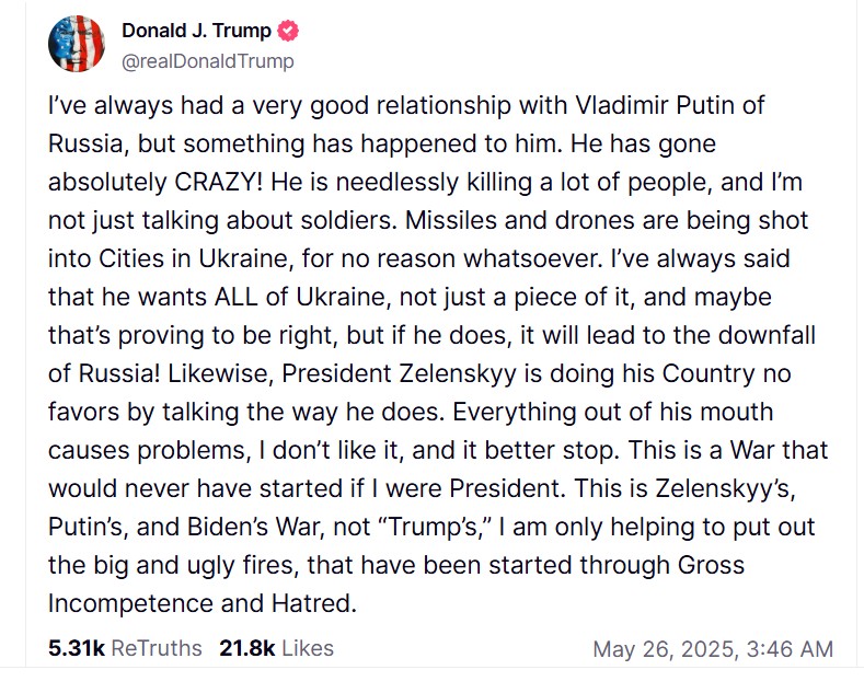 Водночас президент США Дональд Трамп заявив, що Путін завжди хотів всю Україну, але якщо він це зробить, це призведе до краху Росії. Трамп написав, що завжди мав гарні стосунки із Путіним, але з ним щось сталося – він збожеволів.