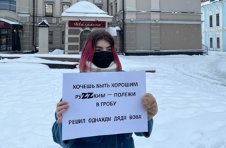 Дівчина вийшла на вулицю з плакатом, що містить перероблені рядки з пісні репера Noize MC.
