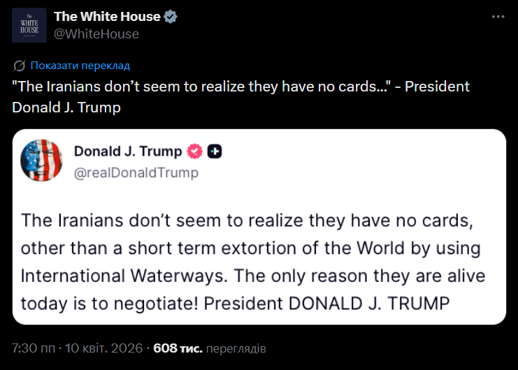 У своїй заяві Трамп різко розкритикував позицію Ірану, наголосивши на слабкості його переговорних позицій. «Іран, схоже, не усвідомлює, що в нього немає жодних реальних козирів, окрім короткострокового шантажу світової спільноти через закриття міжнародних водних шляхів. Єдина причина, чому вони (Іран - ред.) живі сьогодні, – це переговори», – написав він.