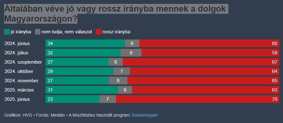Це ж видання опублікувало іще одне цікаве опитування. У ньому респондентів просять відповісти на запитання, добре чи погано йдуть справи в Угорщині. Кількість тих, хто вважає, що в країні все погано, у червні 2025 року сягнула 70%; тих, хто обирає варіант «добре» – 23%; решта 7% при цьому вагається.