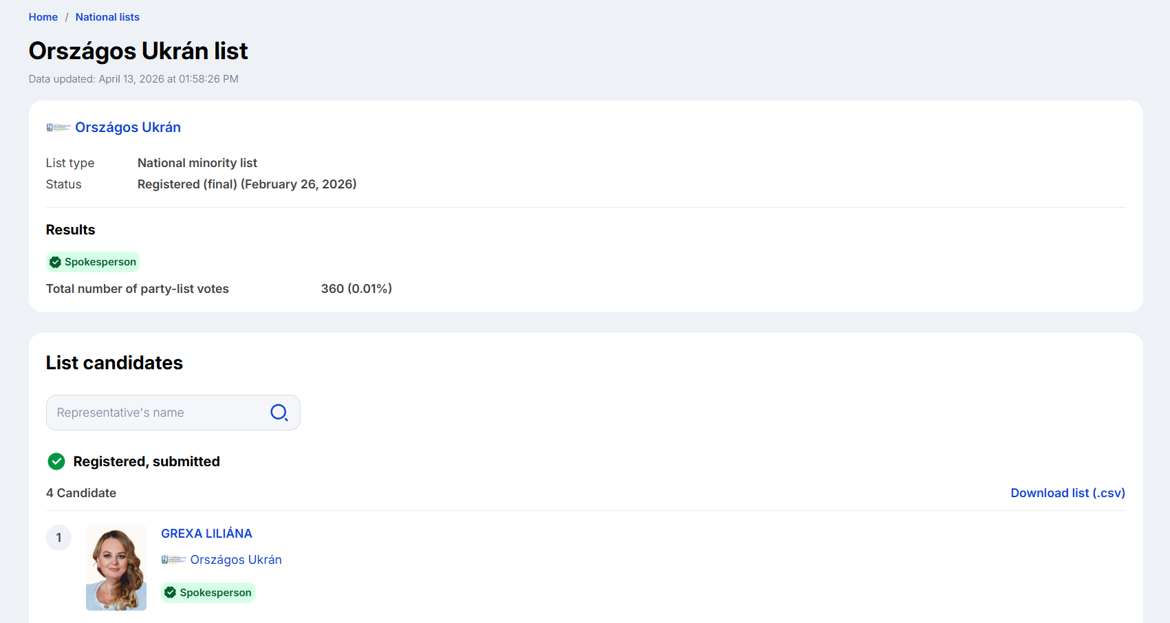 За офіційними даними, список української національної меншини отримав 360 голосів (0,01%). Це дозволяє українській громаді мати власного парламентського представника, попри низький відсоток підтримки.