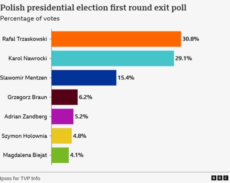 18 травня, о 22.00 за Києвом, у Польщі закрилися виборчі дільниці. Як показав екзитпол, за результатами першого туру президентських виборів у лідери вийшли Рафал Тшасковський та Кароль Навроцький. Перший набрав 30,8% голосів, другий – 29,1%. Розрив мінімальний, але шанси перемогти в другому турі вищі у Тшасковського, це засвідчує опитування, проведене компанією United Surveys для Wirtualna Polska. За нього готові голосувати 55,6% виборців, тоді як Навроцький може розраховувати на 36,6% підтримки.