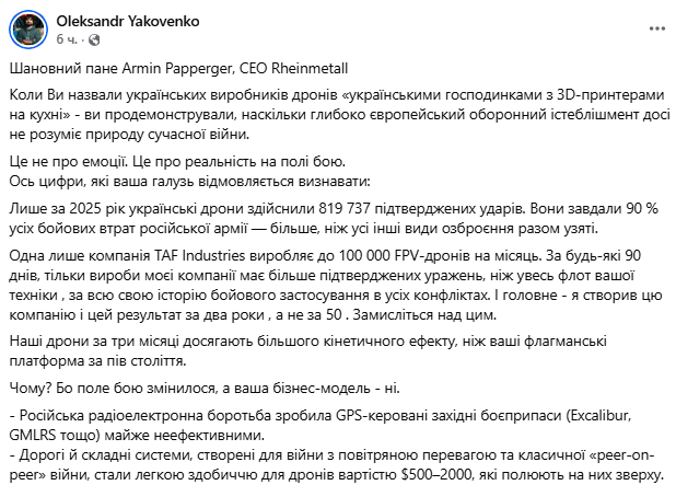 Олександр Яковенко оприлюднив відкритий лист до гендиректора німецького концерну, в якому розкритикував європейський оборонний істеблішмент за нерозуміння сучасної війни та навів приголомшливу статистику ефективності українських дронів.