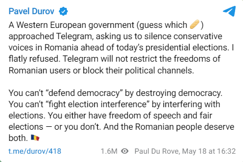 Раніше Дуров заявив, що напередодні президентських виборів у Румунії отримував прохання «заглушити консервативні голоси» в країні.