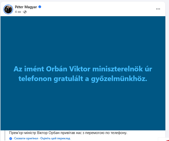 За словами Мадяра, Орбан зателефонував йому особисто та висловив вітання.