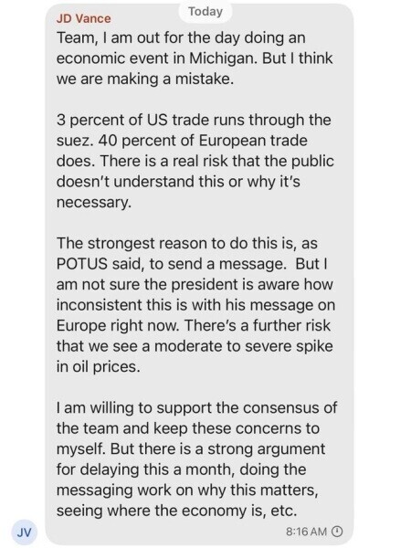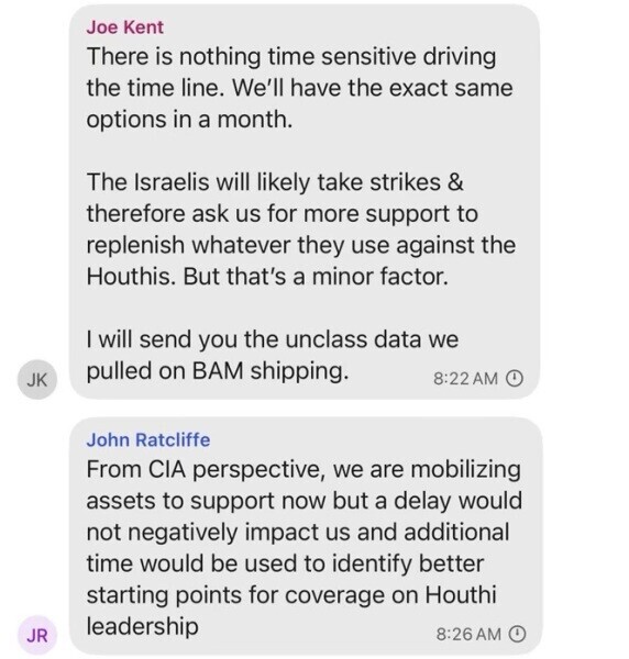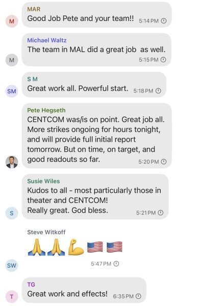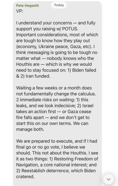 Журналісти The Atlantic опублікували скріншоти переписок у Signal напередодні ударів США по хуситах в Ємені. У Білому домі заявили, що секретних даних Пентагону у чаті не було, проте застерігли не оприлюднювати переписки топ-чиновників США. Про це повідомляє «Главком» з посиланням на The Atlantic.