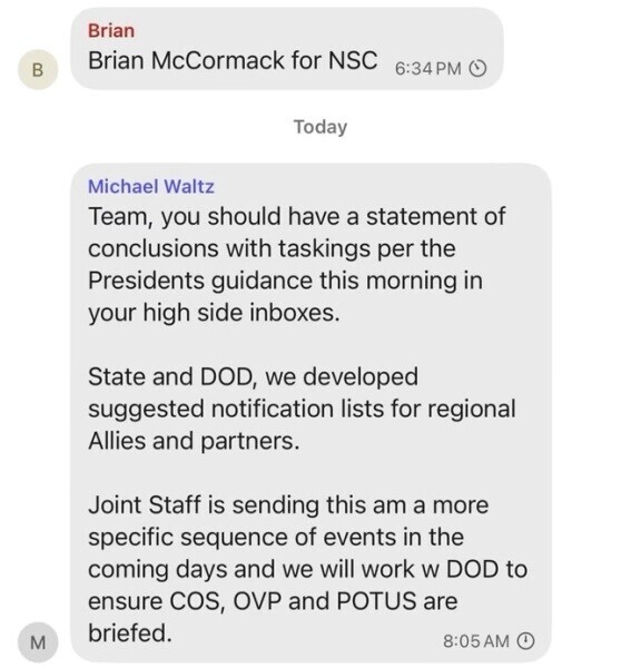 The Atlantic оприлюднив 17 скриншотів із чату в Signal. Листування розпочалося 11 березня, коли до обговорення долучили головного редактора Джеффрі Голдберга, і завершилося 15 березня, коли журналіст покинув чат. Серед оприлюднених матеріалів є скриншоти зі списком учасників, де зазначені імена високопосадовців Білого дому, які відповідають за оборону та безпеку.