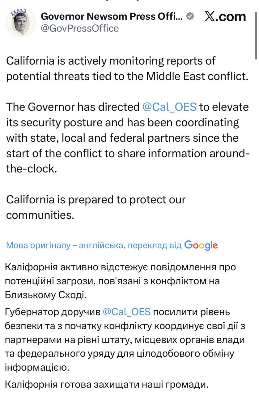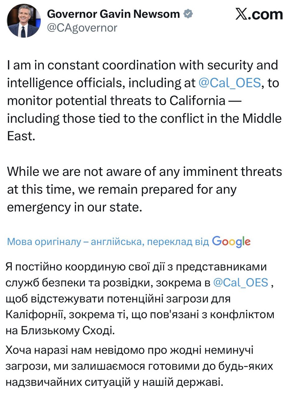 «Я постійно координую свої дії з представниками служб безпеки та розвідки, зокрема з Управлінням з надзвичайних ситуацій Каліфорнії, щоб відстежувати потенційні загрози для Каліфорнії, зокрема ті, що пов’язані з війною на Близькому Сході», – написав він.