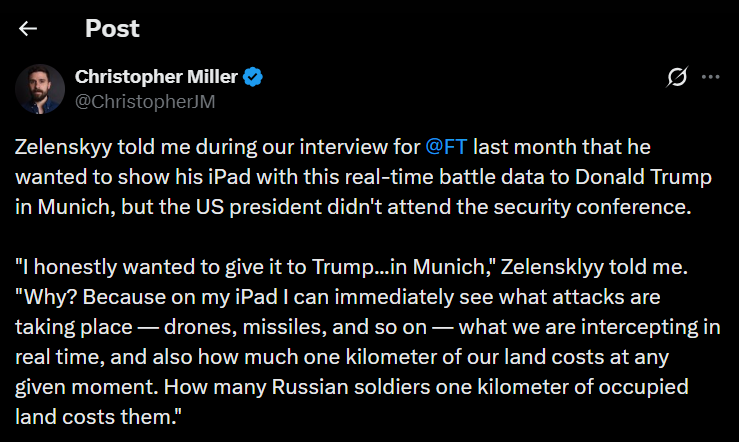 Зеленський зазначав, що хотів передати планшет Трампу під час Мюнхенської конференції з безпеки у лютому 2026 року. «Я, чесно кажучи, хотів подарувати його Трампу у Мюнхені. Чому? Тому що на своєму iPad я можу відразу бачити, які атаки відбуваються – дрони, ракети тощо – які ми перехоплюємо в режимі реального часу, а також скільки коштує один кілометр нашої землі в будь-який момент», – розповів Зеленський.